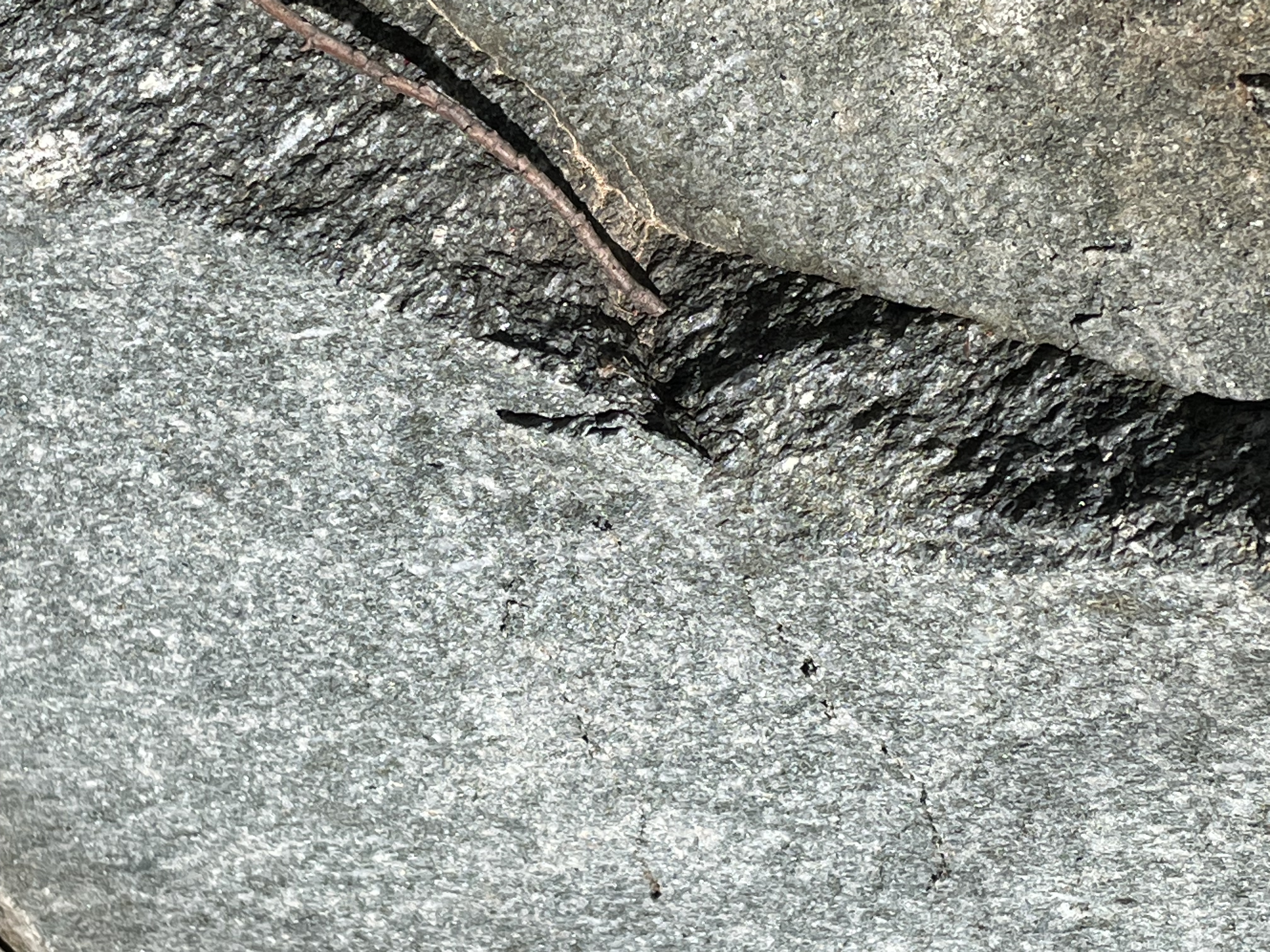 Figure 7. Joint surface within the tonalite. Joints form when the magma has solidified and is brittle, tens if not hundreds of millions of years later. These joints were almost perfectly symmetrical, with 90 degrees between intersecting planes. Such an orientation suggests that the stress regime was uniform (horizontally and vertically). In other words, they occurred during uplift (isostatic stress regime) and not during an orogeny, i.e., they occurred a long time (geologically) after the events these rocks record.