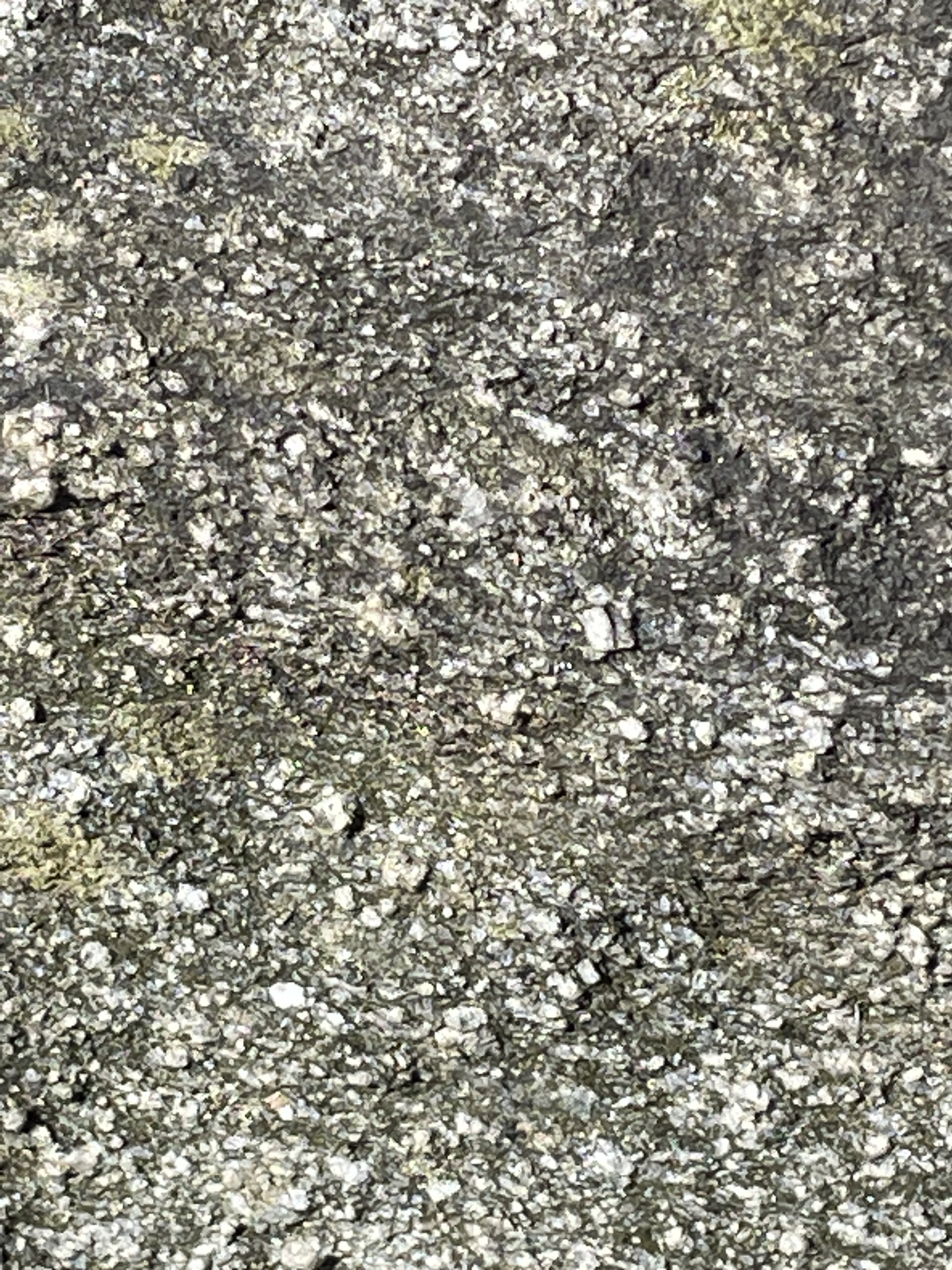 Figure 5. Close-up of tonalite (image about 2 inches across), showing rectangular feldspar crystals and darker biotite and hornblende, which make up about half the composition. The darker minerals weather faster than the feldspar, leaving the latter protruding from the surface. This image also shows a slight foliation, running from the upper left to lower right. Foliation in igneous rocks can be syndepositional (i.e. as the magma cooled) or created when the solid rock is reheated enough to deform without breaking. I think these rocks fall in the first category.