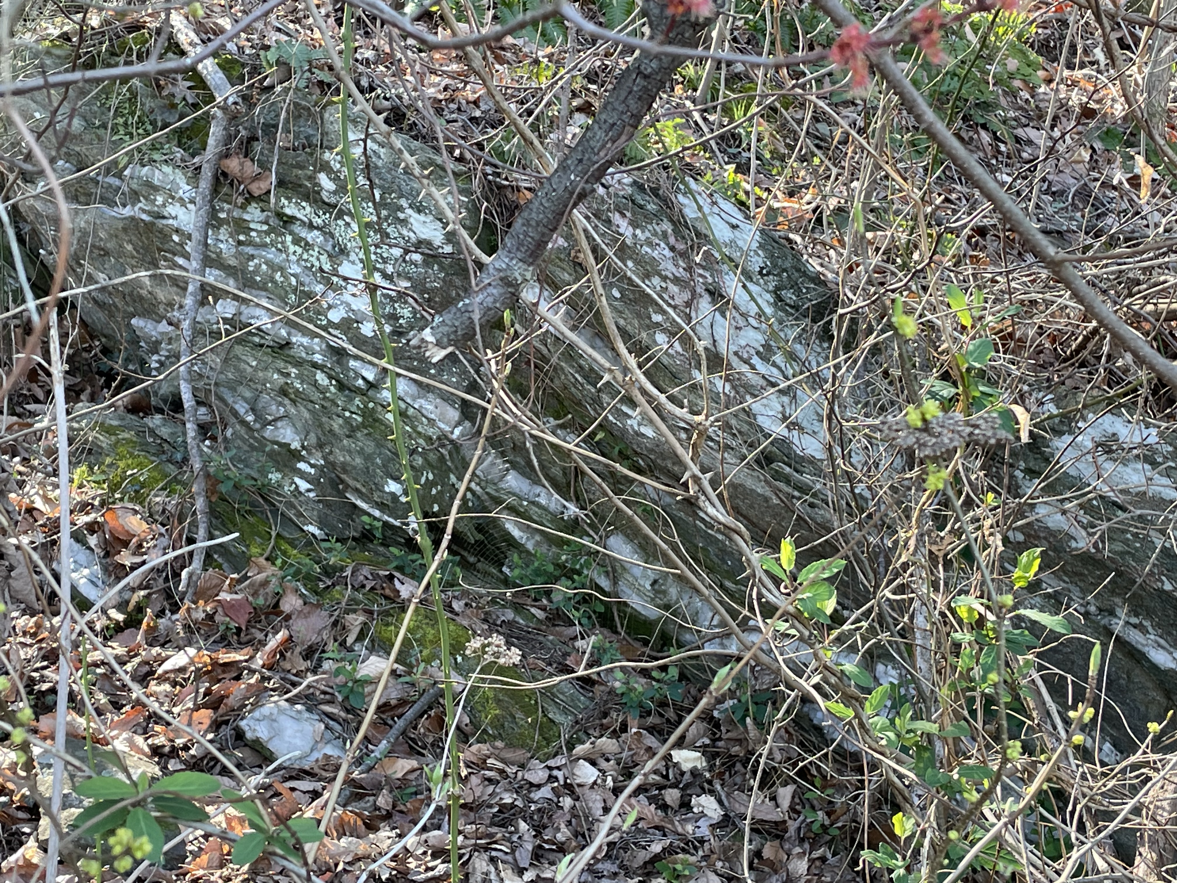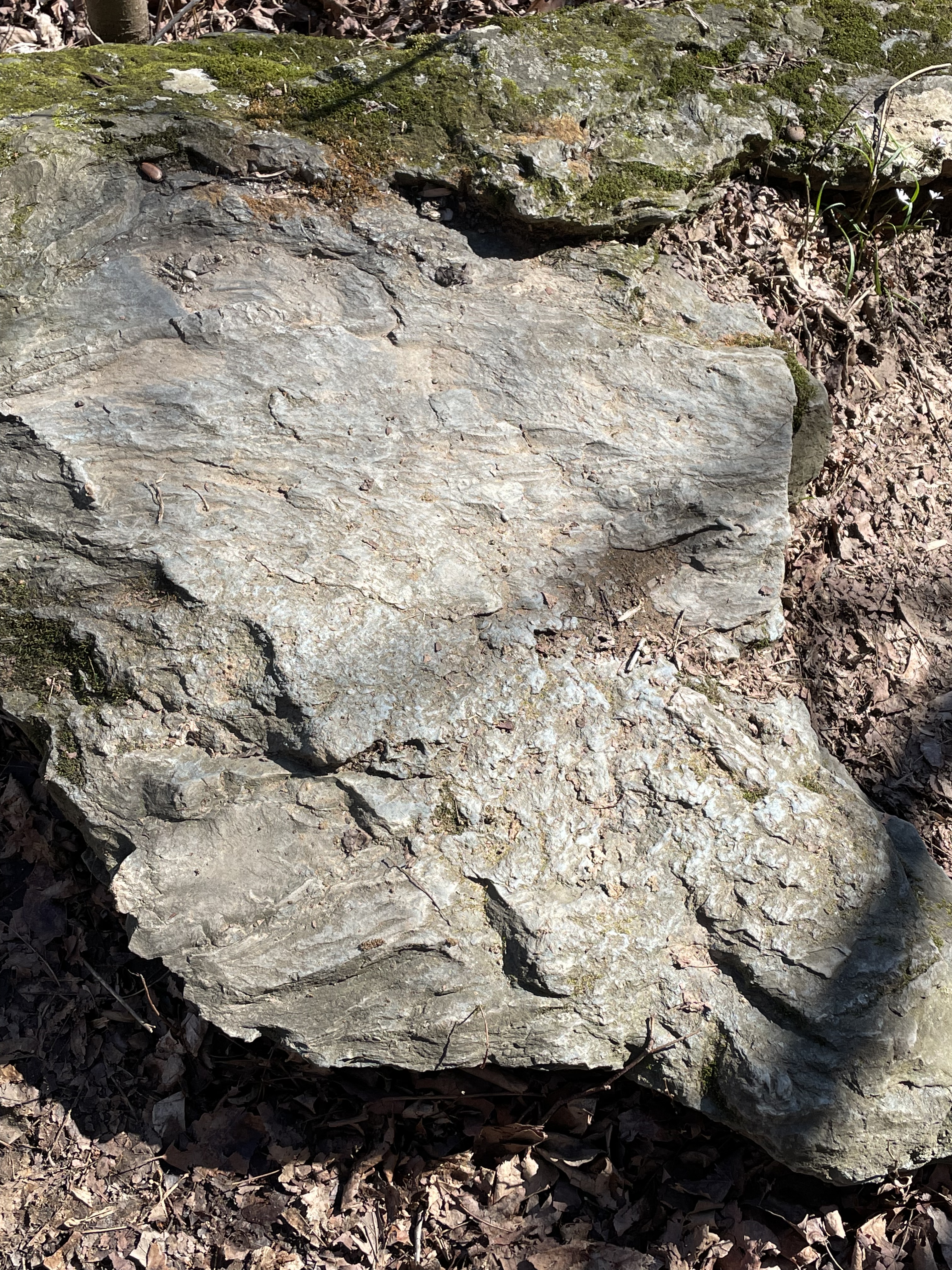 Figure 3. Images from Hawksbill Mountain (elevation 4042 feet), the highest point in Shenandoah National Park. (A) View looking north, showing bedding planes dipping to the SE as we’ve seen throughout NOVA. This is the general structural trend along the eastern margin of North America. These volcaniclastic deposits are part of the Catoctin Formation, dated by radioisotopes to between 1000 and 485 Ma. (B) A close-up shows that these rocks are fissile, which means they are forming thin layers as they weather. They were originally very fine grained, possibly ash or mud (clay minerals) and other weathering products. (C) This photo reveals (despite the dappled shade of trees) a contact (yellow line) between tan and bluish rock that has no other distinguishing features. This must be caused by a slight difference in composition and/or texture that leads to subtle variations in reflected light; if I may speculate, I think the blue ash/sediment filled a depression in the tan material; however, this conjecture is based on the physical environment when this volcanic material was produced. Eruptions were not continuous and there was always a slightly weathered surface upon which new ash was deposited. (D) Outcrop of Catoctin Formation rocks about 600 feet lower than the summit, and much further down-section from the rocks seen in plate A. This basalt/ash was deposited millions of years before what we see in plate A and the magma chamber would have evolved substantially. The original bedding is, as near as I could tell, nearly horizontal rather than tilted to the SE. This implies that brittle deformation (i.e. faulting), which occurred tens of millions of years after eruption, subsequent burial, and metamorphosis, was localized within the larger body of Catoctin Formation rocks (3000 feet thick and extending for many miles); in other words, these metabasalts were hard as rocks (as they say) when they were compressed horizontally. Perhaps they were even transported tens of miles along a thrust fault? We saw evidence of a Precambrian thrust fault at Bull Run Nature Preserve.
