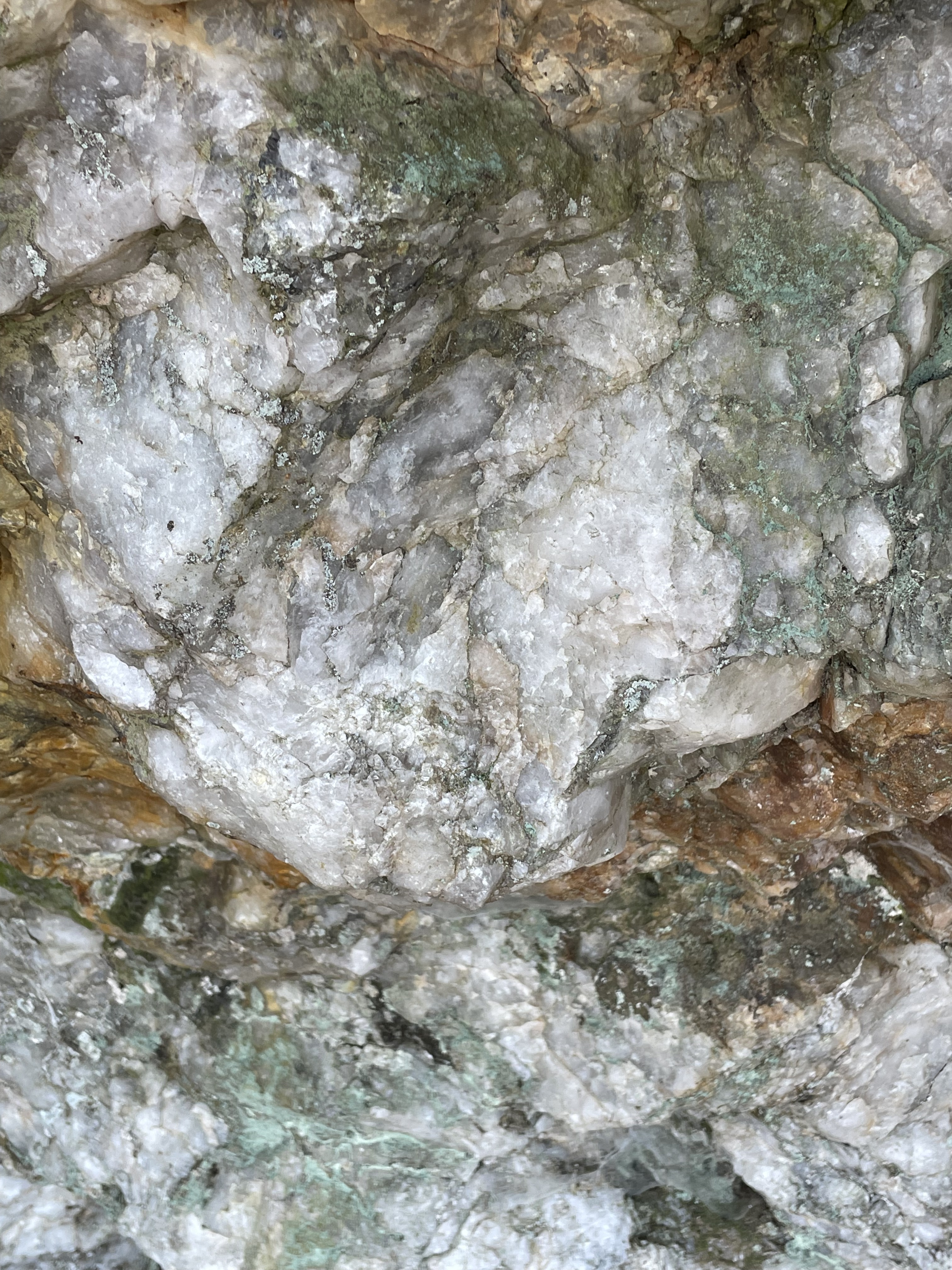 Figure 14. Close-up of the exposure in Fig. 13, showing large quartz nodules. The red stains come from oxidation of iron-rich sediments in the country rock. The image is about two-feet across. The magma didn’t contain an abundance of rare-earth elements, but this looks like a pegmatite to me. Pegmatites form from excess quartz and other incompatible elements (e.g. lithium, tantalum, molybdenum) that remain in the last bit of semifluid as the magma cools; thus they are injected into the country rock as veins following weak zones (e.g. Fig. 11) to form large inclusions.