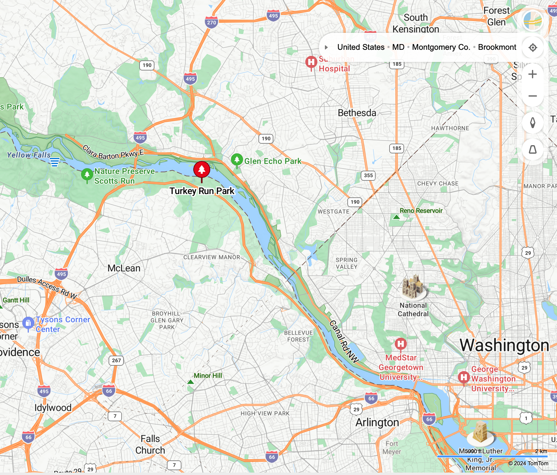 Figure 2. Map showing Turkey Run Park relative to Washington DC. Further upstream, at Scotts Run (labeled on the map), we saw Proterozoic (2500 – 542 Ma) metamorphic rocks.