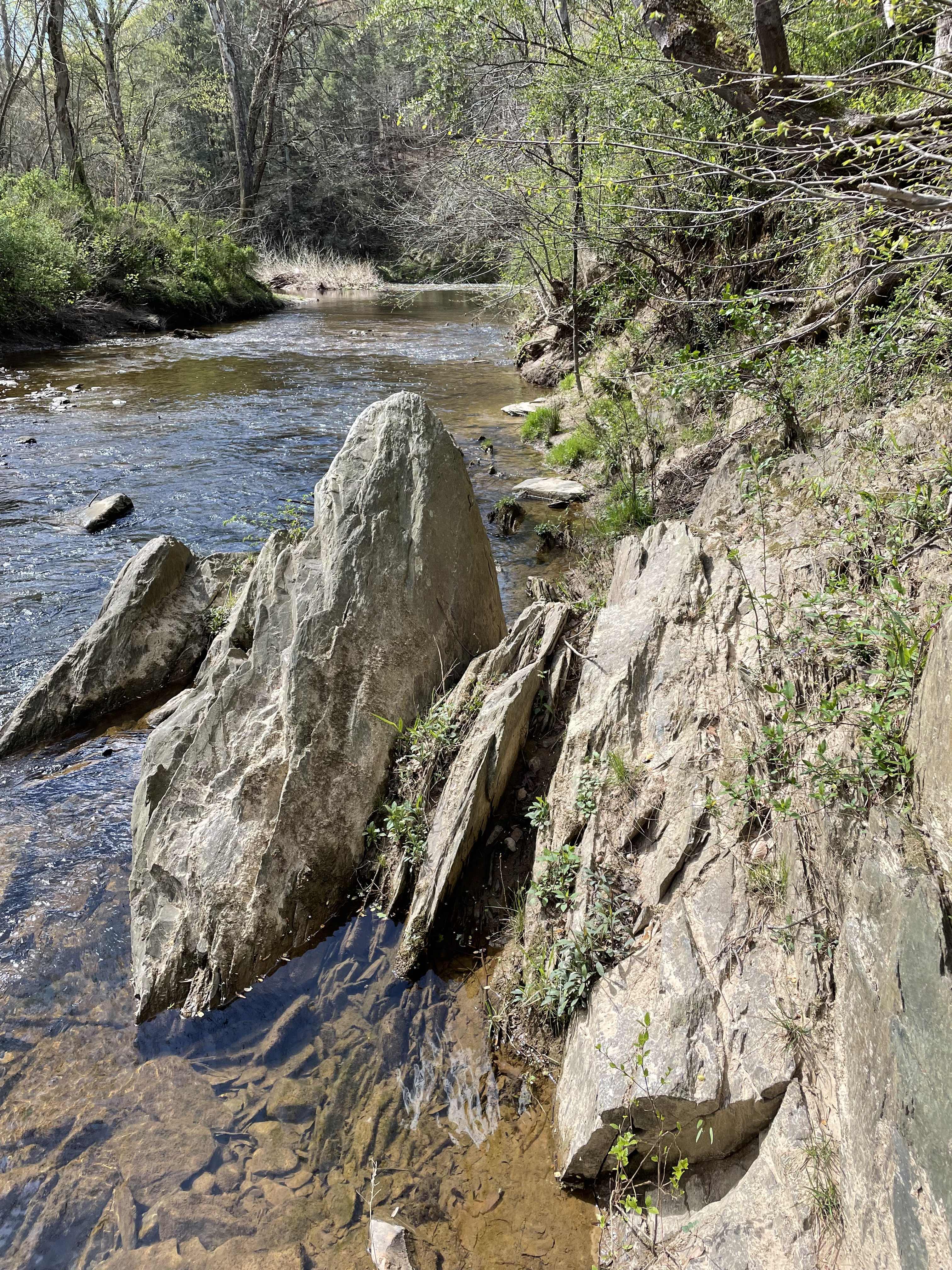 Figure 5. Photo taken further to the south along Bull Run (see Fig. 4), where the rocks aren’t as weathered as further upstream. Their metamorphic grade is increasing as well.