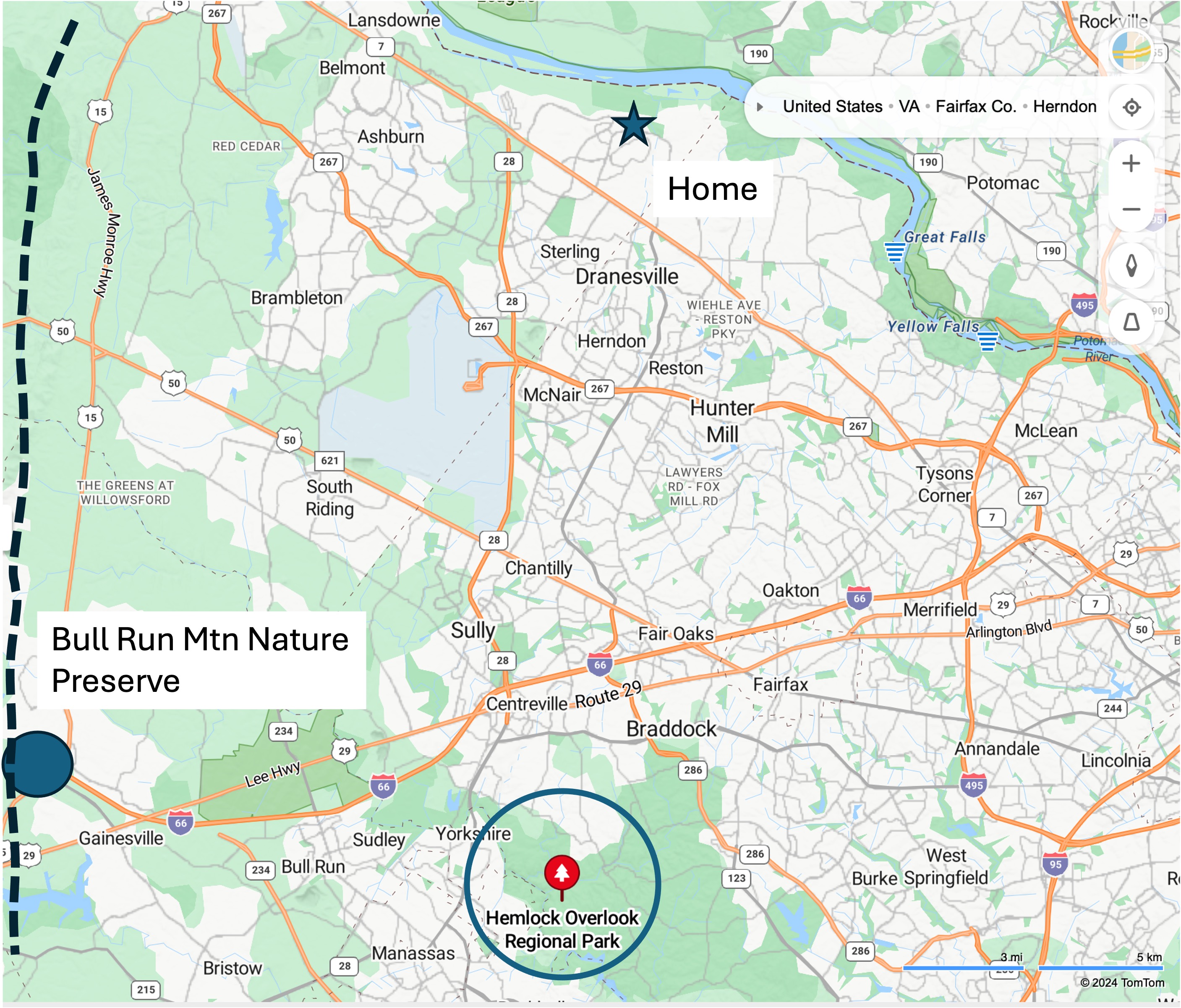 Figure 2. This map shows the area I have been exploring in recent posts. Hemlock Overlook Park is circled. Note that the study area is less than 10 miles from Bull Run Fault (dashed line), and an area we studied previously (indicated by the purple circle to the left of the map).